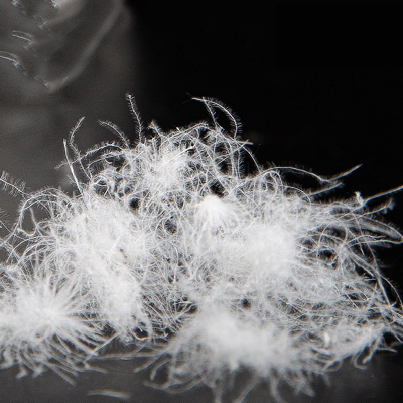 Được chọn lọc từ những vùng lông tơ tự nhiên của vịt như bụng, cổ và cánh, lông tơ có hình lông tơ mịn, mềm mại như mây; được bổ sung bởi các lông vũ có tỷ lệ chính xác, nó tạo thành một ma trận khóa nhiệt độ hai lớp. Là một loại sợi động vật tự nhiên, cấu trúc giống như quả bóng của lông tơ được bao phủ dày đặc với hàng trăm triệu lỗ chân lông siêu nhỏ hình tam giác, tạo nên chu trình thở thông minh. Khi nhiệt độ cơ thể tăng lên, chất xơ sẽ giãn ra một cách tự nhiên để giải phóng nhiệt và khi môi trường nguội đi, nó sẽ co lại chặt chẽ để giữ ấm. Trong khi tái chế hiệu quả nhiệt lượng tỏa ra từ cơ thể con người, nó cách ly sự xâm nhập của không khí lạnh từ thế giới bên ngoài và đạt được khả năng bảo vệ nhiệt độ ổn định suốt 24 giờ. Nhẹ và không thể nhận thấy, nó vừa vặn với cơ thể như lớp da thứ hai, tạo sự ấm áp và thoải mái liền mạch.